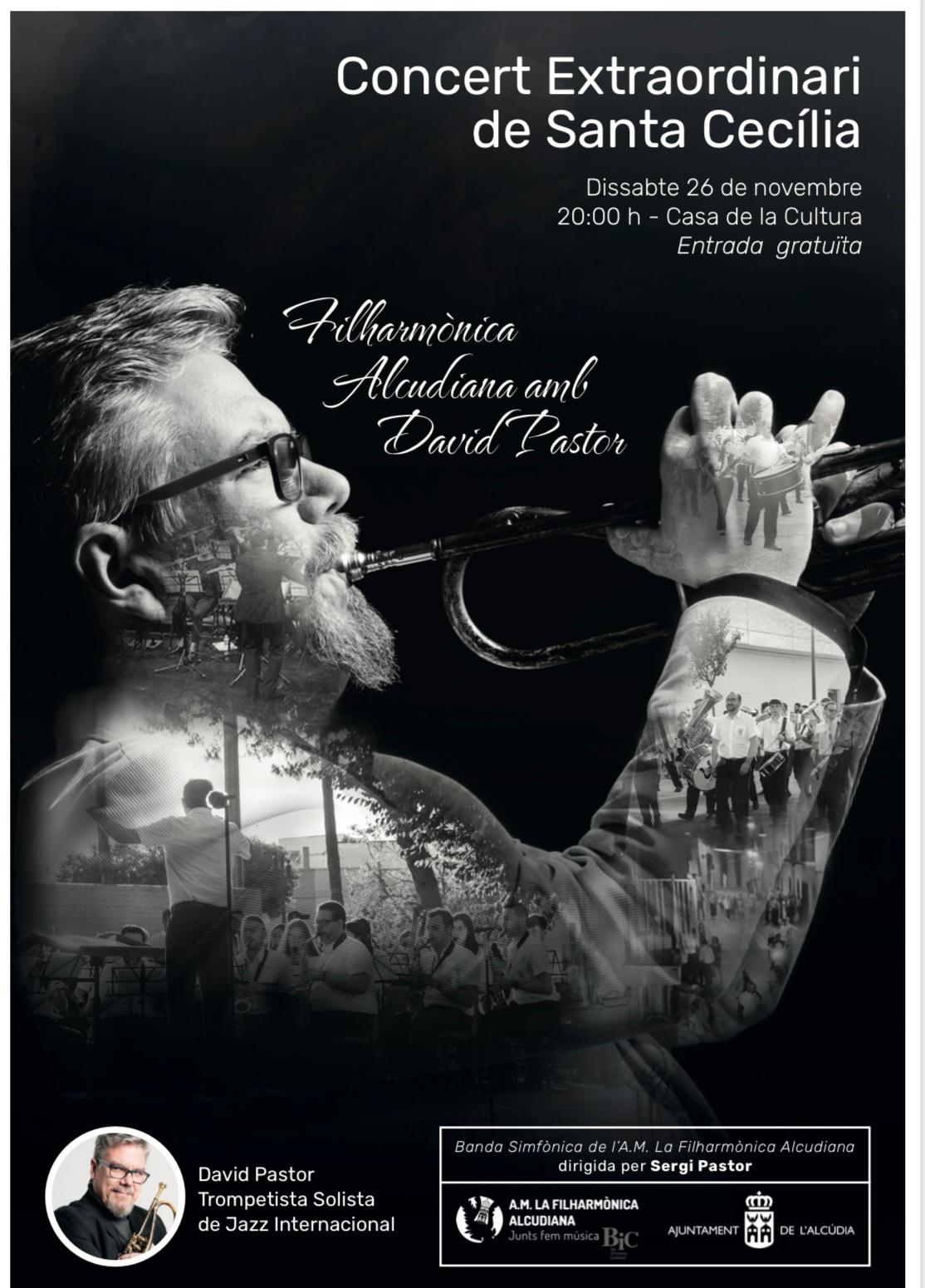 Dissabte 26 de novembre a les 20h a la Casa de la Cultura, concert de la Filharmònica Alcudiana en honor a Santa Cecília amb el trompetista internacional David Pastor solista de jazz i dirigits pel director Sergi Pastor.