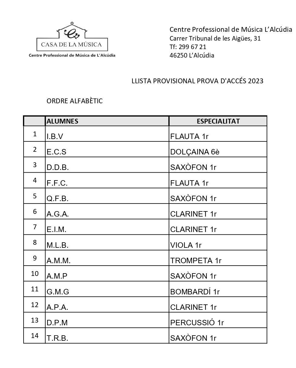 Llistat provisional d'alumnes inscrits per a les proves d'accés a ensenyances professionals en la primera convocatòria, data de l'examen el 23 de juny.